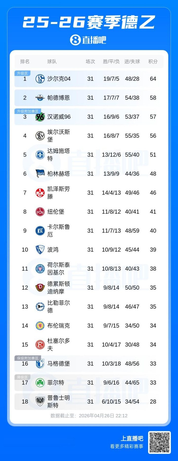 菠菜的平台注册金按照规则,赛季结束后德乙前两名直接升级,第三名和德甲倒数第三进行两回合升降级附加赛。下一轮沙尔克04只要主场战胜杜塞尔多夫,就将提前两轮确定升级。